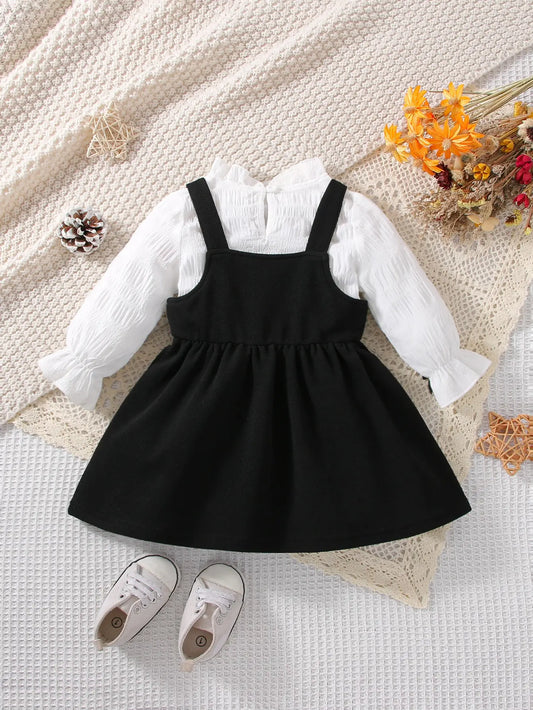 2-Piece Baby Girl Spring and Autumn White Long Sleeve with Black Strap Skirt